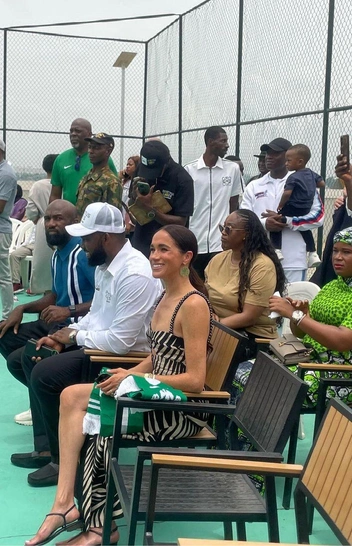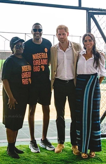 Вчера волейбол, а сегодня — баскетбол. Третий день «королевского» тура начался с посещения баскетбольного матча в благотворительной организации Giant of Africa в Лагосе. Меган надела свой фирменный предмет гардероба, за который она полюбилась поклонникам еще на трибунах Уимблдона в 2019 году — белую рубашку от своего фаворита Carolina Herrera. Образ дополнили босоножки аж 2013 года, которые герцогиня носила еще в бытность актрисой, а также колье с именами своих детей. В то воскресенье в Америке отмечали День матери, так что Меган решила надеть сентиментальное украшение.
