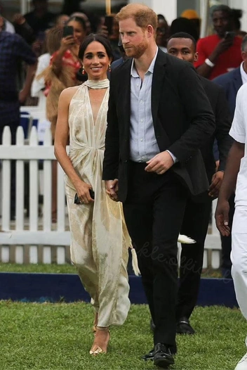 Ну и куда же без поло? Любимого вида спорта принца Гарри, про который он даже решил снять фильм для Netflix. В тот день игроки разделились на две команды — первая играла за герцогиню, а вторая за принца Гарри. Меган выбрала, пожалуй, самое откровенное платье в своем гардеробе. Струящаяся ткань, нежные цвета, глубокое декольте и полностью открытая спина. Образ дополнили все те же золотые украшения, которые Меган демонстрировала в этом туре, а также аккуратный пучок (читайте также: Всегда идеальна: эволюция стрижек Меган Маркл — вы точно не заметили перемен).