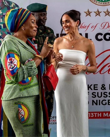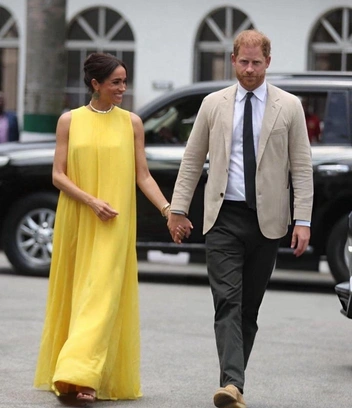 В тот день Меган и Гарри встретились с начальником штаба обороны Нигерии генералом Кристофером Гвабином Мусой, который и пригласил пару посетить Нигерию. В тот день Меган превзошла сама себя в приверженности осознанному потреблению — весь ее лук состоял из вещей, которые не первый год висят в гардеробе герцогини. Например, это желтое платье Carolina Herrera. Сначала оно наделало много шума — поклонники пары восторгались, где же Меган нашла такой потрясающий аутентичный костюм. Пока не поняли, что в этом же платье Сассекская была и в фильме Netflix во время второй беременности, и на снимках с дня рождения принца Арчи (читайте также: Все ради выгоды: как Меган и Гарри все еще наживаются на связях с королевской семьей (и чем это может кончиться)).