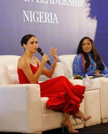 Последний лук Меган показала для форума «Женщины в лидерстве», где герцогиня стала главным приглашенным спикером. Меган подняла тему равенства полов и прав женщин и мужчин на равную зарплату и продвижение по карьере. Красный — совсем не свойственный для Меган цвет, но в этот раз она решила отдать дань уважения нигерийскому народу и выбрала местный бренд платья. Впрочем, возможно руку к ее гардеробу приложила все та же Джейми Мизрахи — и теперь мы увидим еще больше выходов в ярких цветах.