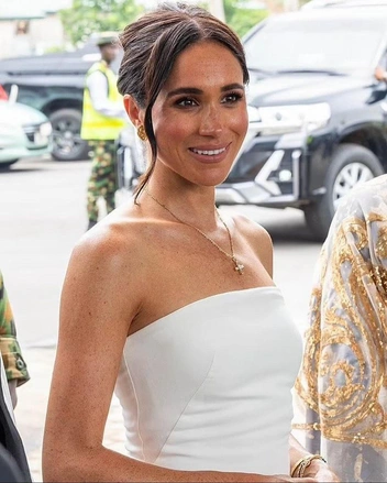 После волейбола Меган и Гарри отправились на банкет в штаб обороны страны. Мероприятие посвятили семьям погибших ветеранов войн, а также близким отношениям Великобритании и Нигерии. Меган выбрала элегантное белое платье приталенного силуэта и лодочки своего любимого бренда Aquazzura. Завершил образ фирменный пучок герцогини и винтажные серьги от Dior.