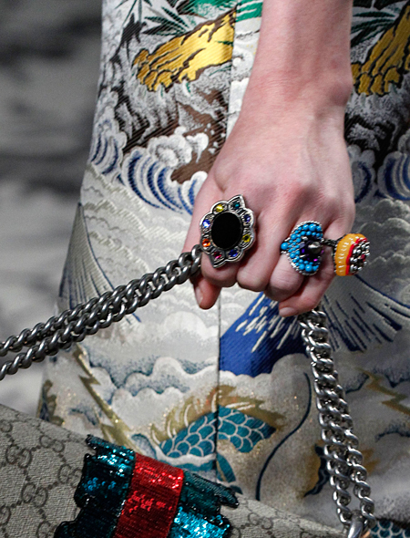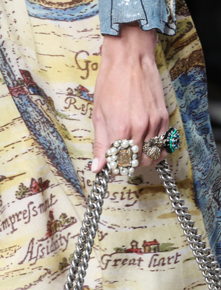Кольца в этом сезоне – вещь не обязательная. Но если уж вы решите украсить свои пальцы, то делайте это максимально броско. Кольца должны быть крупными, яркими, фантазийными по форме. И еще лучше – их должно быть много (правда, это автоматически лишает вас возможности надеть браслеты или часы). За самыми смелыми идеями идем к Gucci.