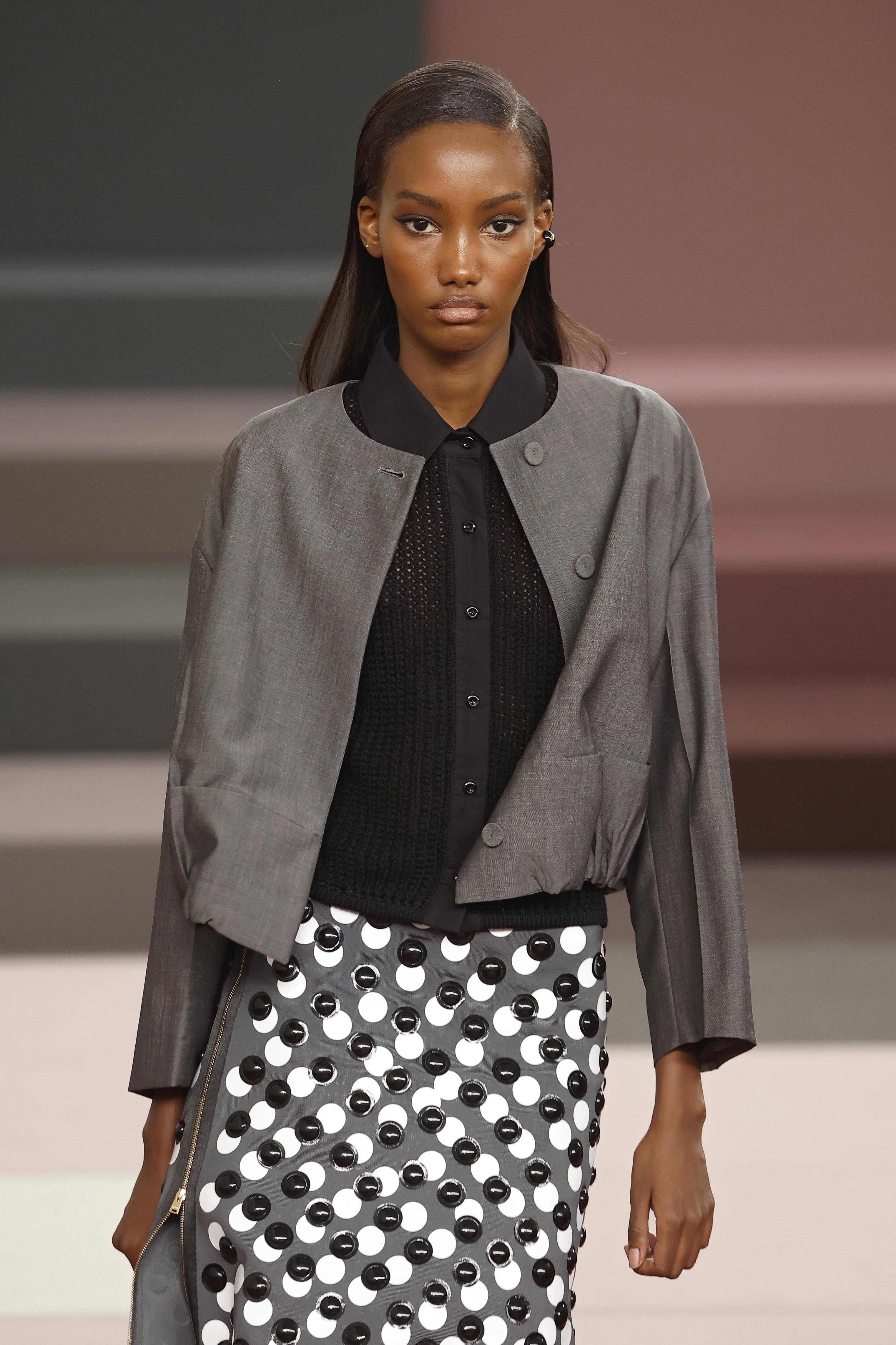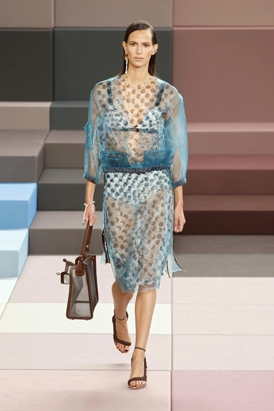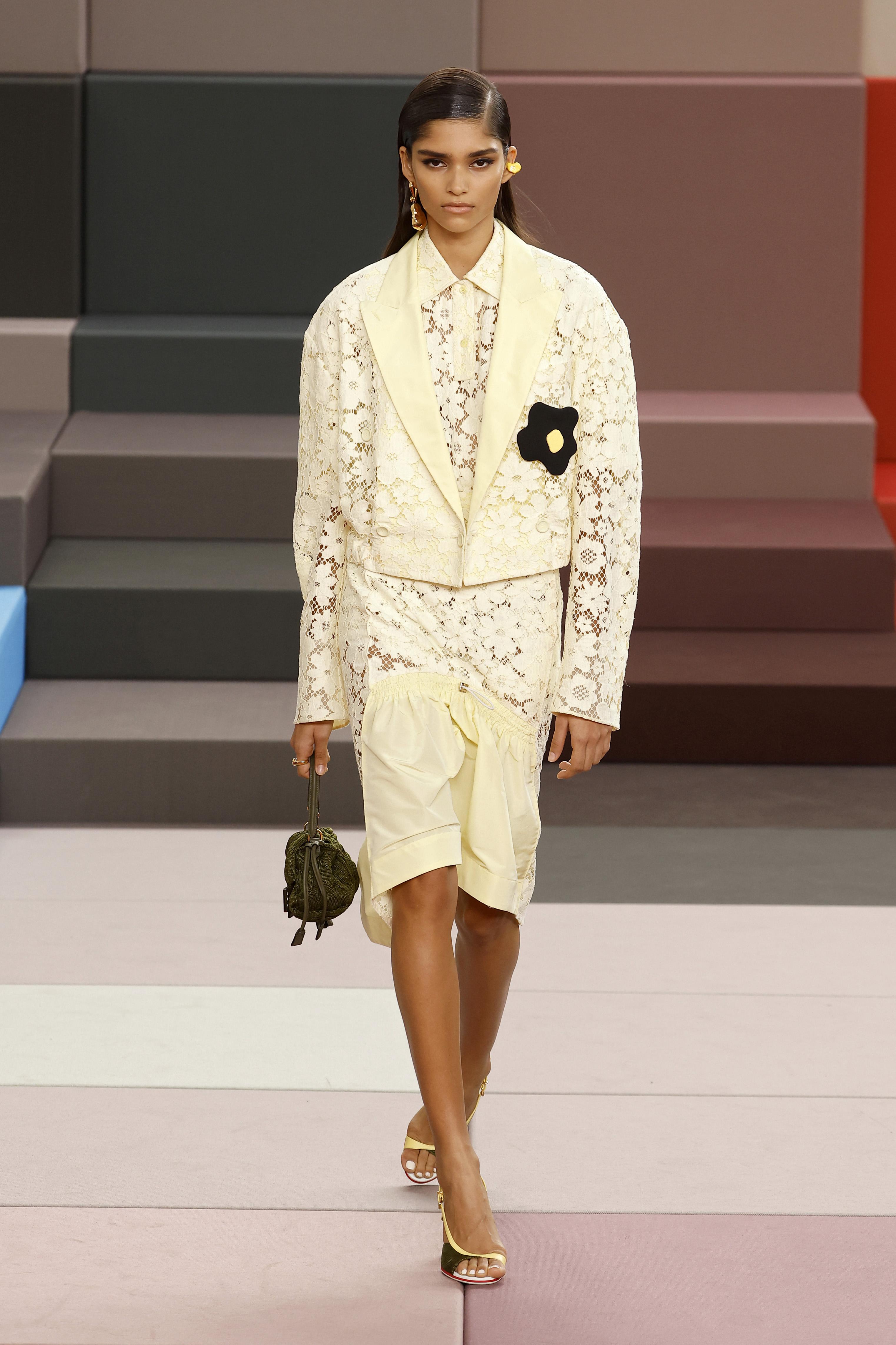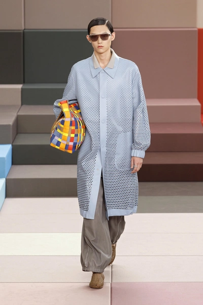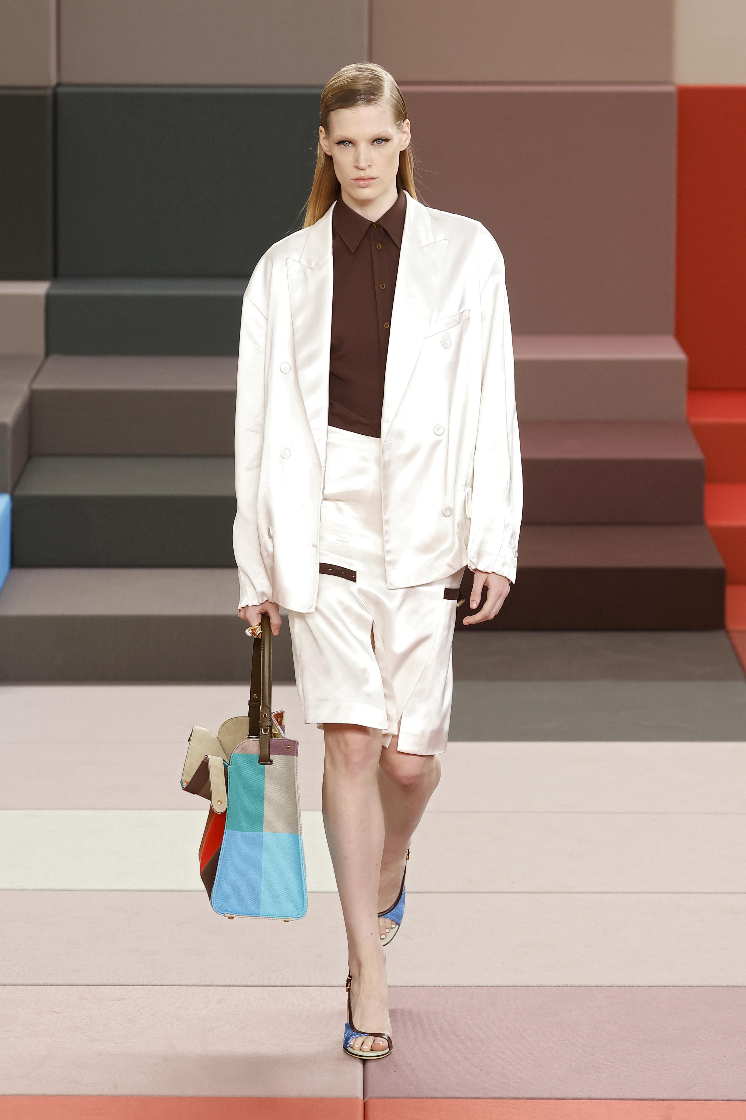 Происходящее вокруг моделей полностью продолжалось в их нарядах. В этот раз Сильвия Вентурини Фенди объединила сложное с простым: к лаконичному крою она добавила активные фактуры, насыщенные оттенки и броские принты. Полька-дот у нее дублируется сразу в двух оттенках, пальто и сумки оказываются сплетены из полосок ткани, подвороты на рукавах окрашиваются в контрастный самой футболке цвет, трикотажные костюмы только крупной вязки, а самые классические рубашки украшаются цветочными перфорациями.
