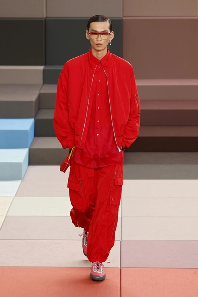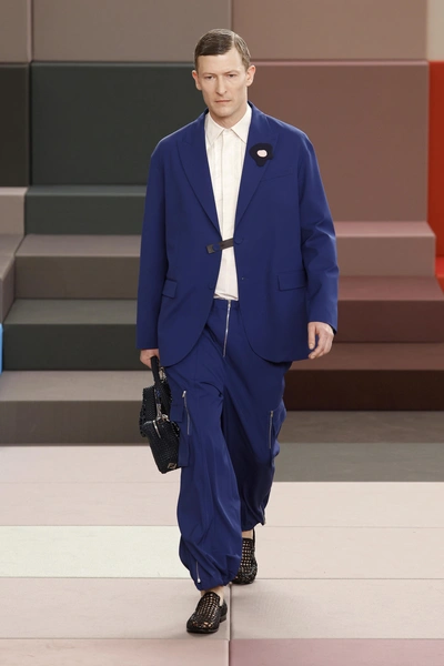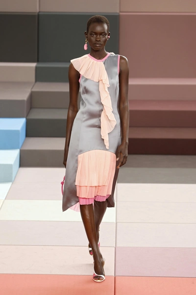 На это работает не только сама одежда, но и яркий сет-дизайн. Подиум для бренда сложили из разноцветных кубов — они же стали сидениями для гостей и декорациями на стенах. Эту задумку для Дома разработал Марк Ньюсон, известный австралийский дизайнер.