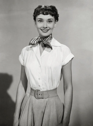 Красочные шелковые платки с принтами Одри обожала с юности и носила их практически всю жизнь. Причем за время своих модных выходов она показала, насколько вариативным и универсальным может быть этот аксессуар. В ленте «Римские каникулы» она появляется в мини-юбке в стиле 50-х, легкой льняной рубашке и шелковом платке, повязанном вокруг шеи. А позже она дополняет этим аксессуаром женственные платья в стиле new look, приталенные пальто и свои излюбленные тотал-блэк ансамбли с водолазками и классическими брюками, завершая образ крупными очками.