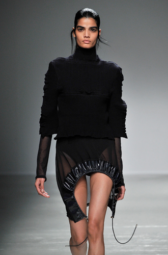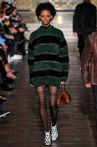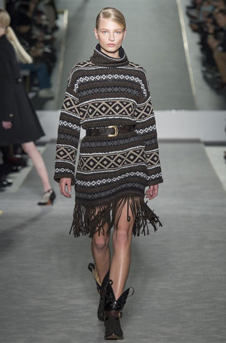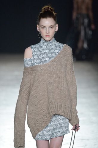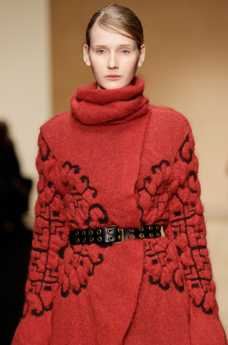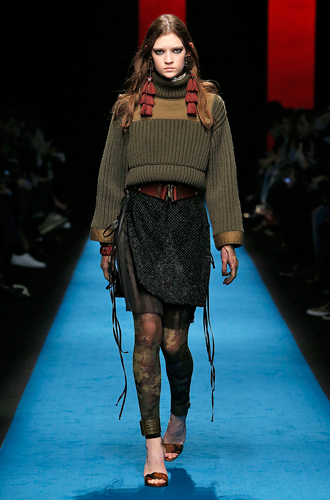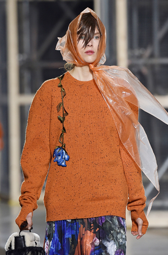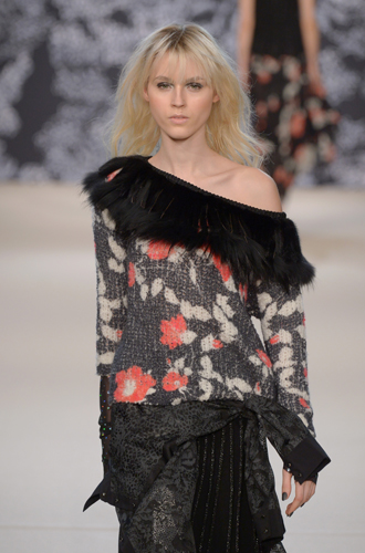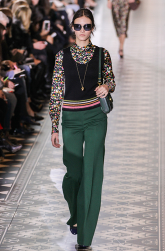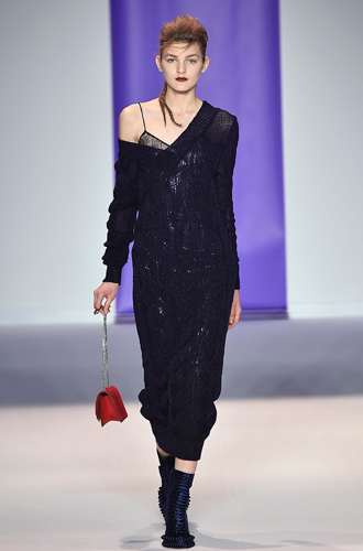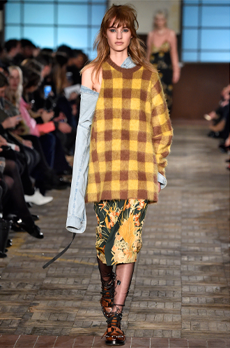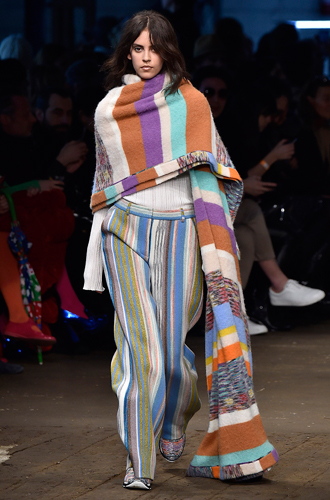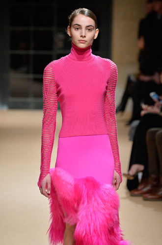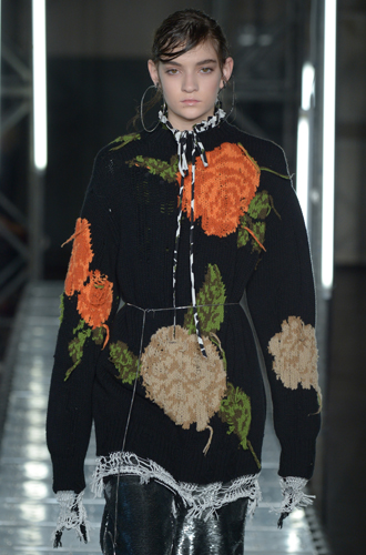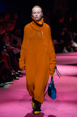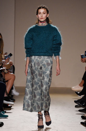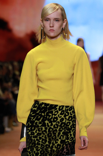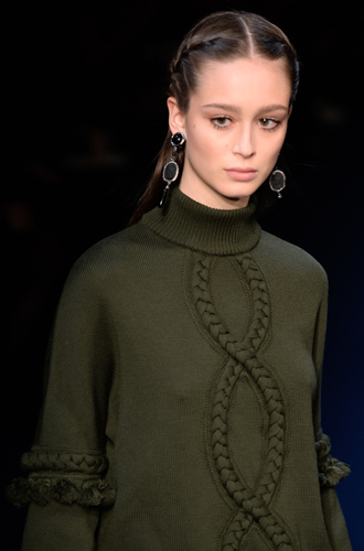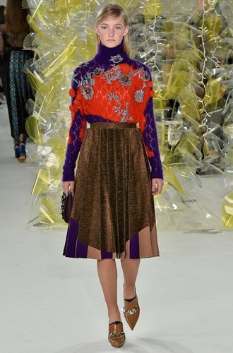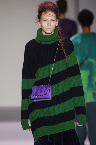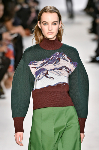 Дизайнеры предпочли видеть свои модели в самых актуальных цветах нынешнего сезона – фуксии (как Esteban Cortazar), темно-синем (Carven), зеленой листвы (Marco De Vincenzo) и черном (Lea Peckre). А у модели Emilio Pucci на передней стороне свитера с объемными рукавами развернулись горные пейзажи.