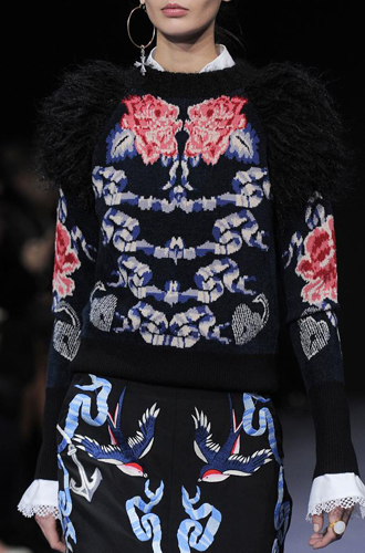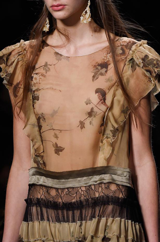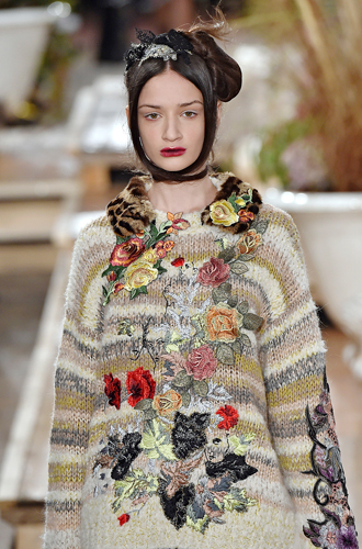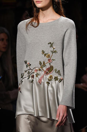 Самые яркие модели oversize модные Дома Christopher Kane и MSGM сочетают с блестящими летящими юбками миди. Большинство же представленных предметов гардероба заключают в себе атмосферный тренд «вещь из бабушкиного сундука» (как у Manish Arora и Antonio Marras), а модели с ручной цветочной вышивкой встречаются у Alberta Ferretti и N 21, дополненные надетыми под низ платьями или блузами.