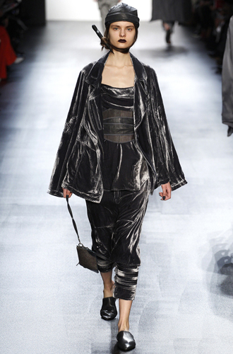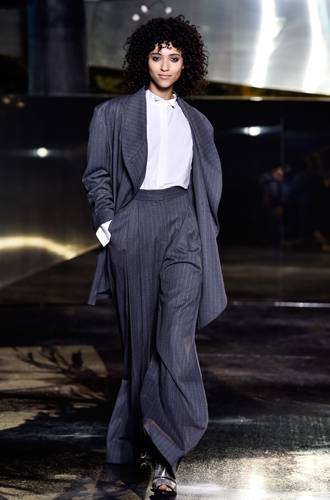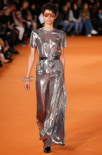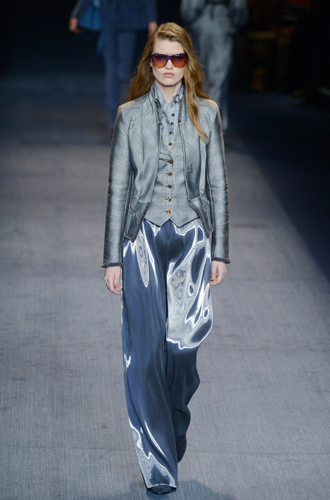 Нам особенно приглянулись брюки в пижамном стиле цвета металлик у Trussardi. Выглядят они так, будто обладательница облачилась в расплавленное серебро.