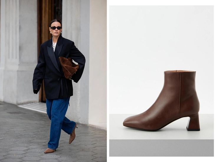 Ещё одна пара, которая придаст женственности образу не в ущерб удобству — ботильоны на устойчивом каблуке. В текущем сезоне ведущие бренды продемонстрировали различные вариации: цилиндрический, квадратный, скошенный деревянный каблук, отсылающий нас к эстетике бохо и хиппи. Мыс выбираем в зависимости от желаемого впечатления: для того, чтобы добавить флер дерзости добавляем в гардероб модели с острым мысом. А более мягким натурам подойдёт универсальный круглый мыс. Сочетаем такую обувь с низом прямого кроя или брюками-палаццо, джинсами, юбками и платьями длины миди и макси.
