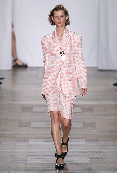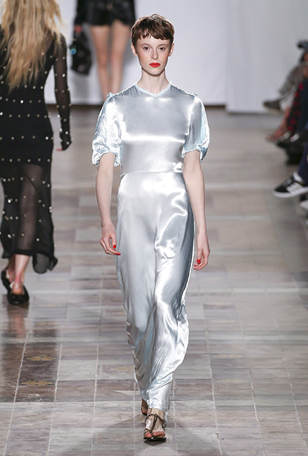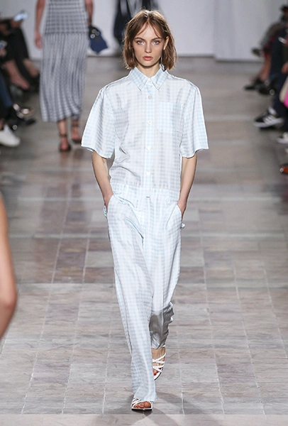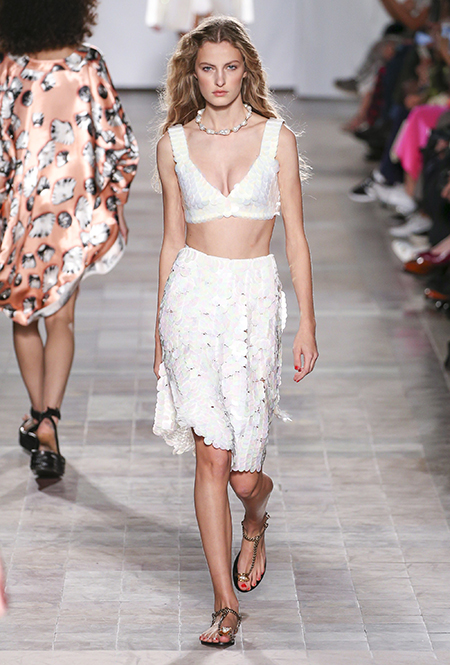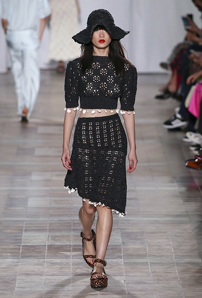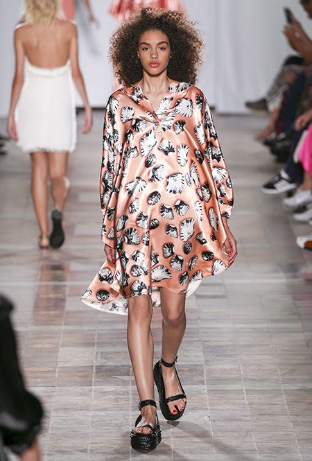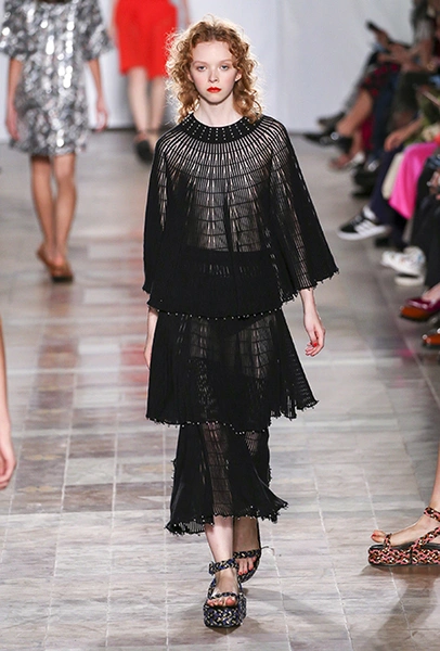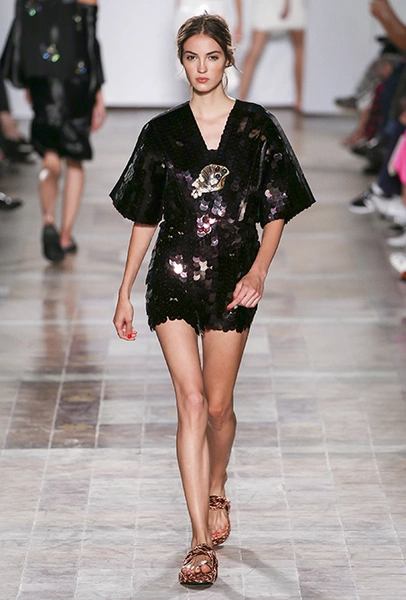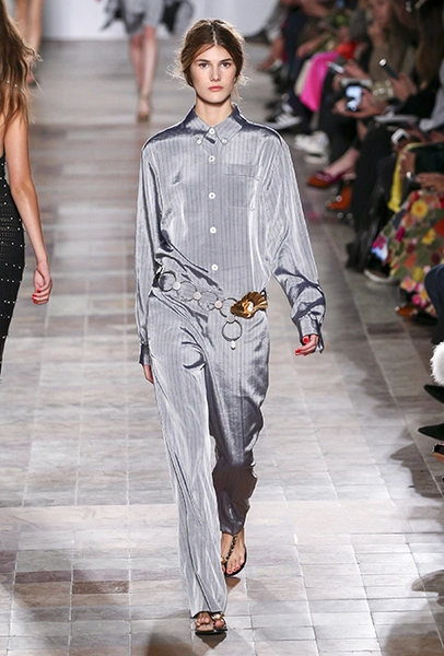 Коллекция выглядит по-летнему расслабленной не только благодаря обилию тонких тканей, топов и вырезов, но и за счет темы, которую де Либран выбрала основной – это ракушки и моллюски. Маленькими раковинами украшены подолы платьев и края карманов на полосатом костюме-пижаме. Золотистые ракушки блестят на поясе полосатого обтягивающего платья и на бортах широкого клетчатого жакета. Узкие длинные вечерние платья расшиты жемчугом (его, как известно, добывают из морских раковин), шеи моделей украшают ракушечные бусы. Конечно, не обошлось и без соответствующего принта – им украшено переливающееся на свету платье свободного кроя из розового шелка.