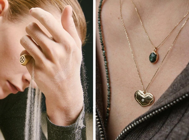 «Представьте себе золотое винтажное украшение, которое забрала к себе большая вода и вернула обратно, с любовью отгладив линии, — это будет похоже на то, что создаю я», — поэтично описывает свои изделия Анна Масловская. Она работает с золотом, драгоценными и полудрагоценными камнями, а также с шелком, шерстью и деревом. У бренда есть печатки с символом луны и бриллиантом, колье с говорящими названиями «Безусловная любовь» и «Четыре стороны света», а еще кольца и подвески с «молитвой» — сложенными около сердца руками. Все украшения лаконичные, деликатные и продуманы так, чтобы их можно было бы не снимать на ночь.