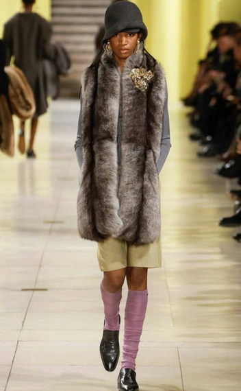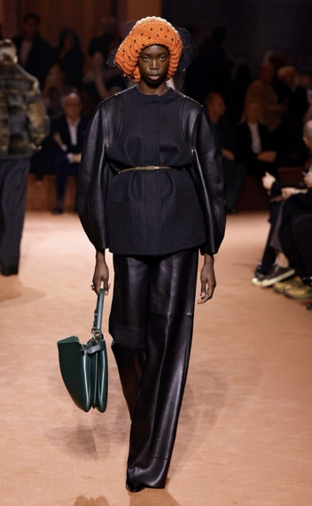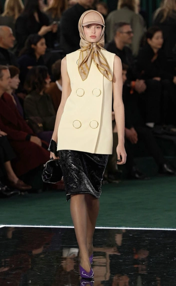 А если хочется добавить оригинальности в образ с кепкой, то повяжите к ней стильный и яркий платок, как сделали дизайнеры Gucci на показе осенью 2025 года. Бежевая кепка, а сверху небрежно повязан платок, покрывающий голову. Обратите внимание на сочетание цветов — Gucci выбрали бежевый платок, который, тем не менее, не сливается с кепкой из-за золотых деталей. Второй вариант сочетать платок — с шляпой, тут референсы раздает Louis Vuitton.