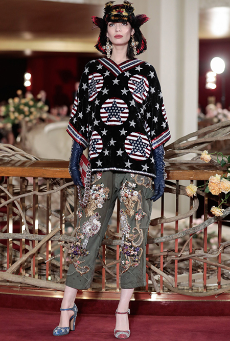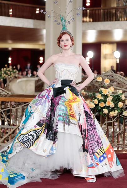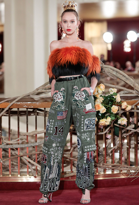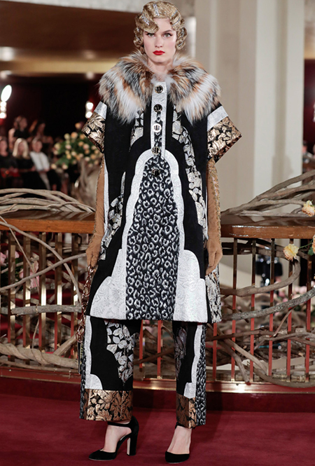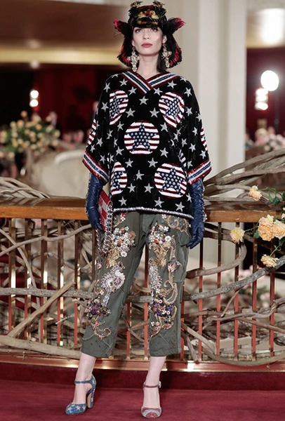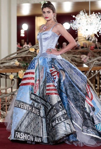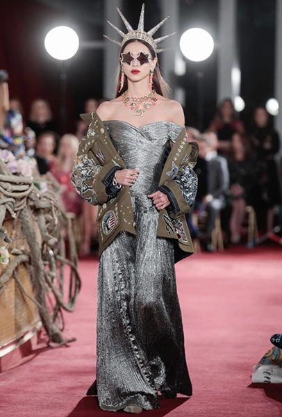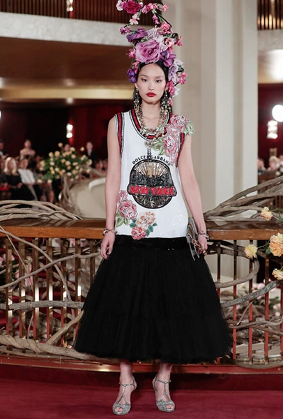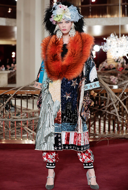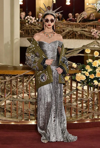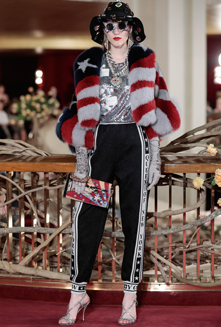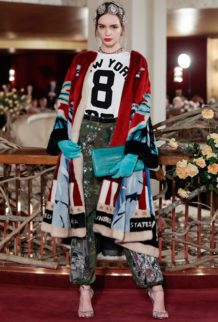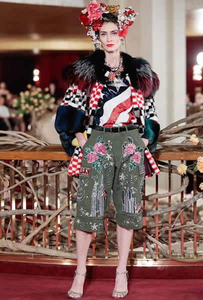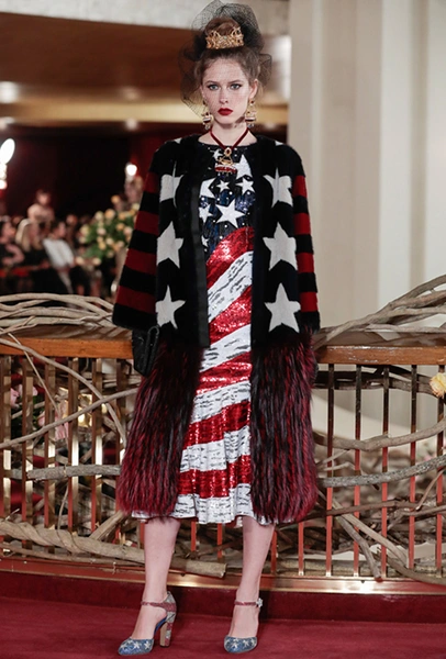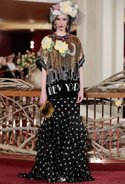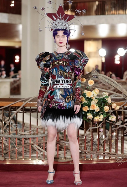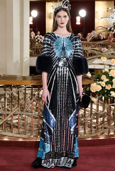Что до коллекции, то в ней все то, за что клиенты обожают творчество Доменико и Стефано: длинные платья, обилие сверкающих пайеток, костюмы со смокингами, длинная бахрома, пышные перья, разноцветные аппликации и, конечно же, натуральный мех. Нью-йоркскую тему коллекции дизайнеры подали весьма прямолинейно, изобразив на платьях самые знаменитые виды Большого яблока: Эмпайер-стейт-билдинг, сияющие плазмы Таймс-сквер, Бруклинский мост, сама Метрополитен-опера и, конечно же, символ американской демократии — статуя Свободы.