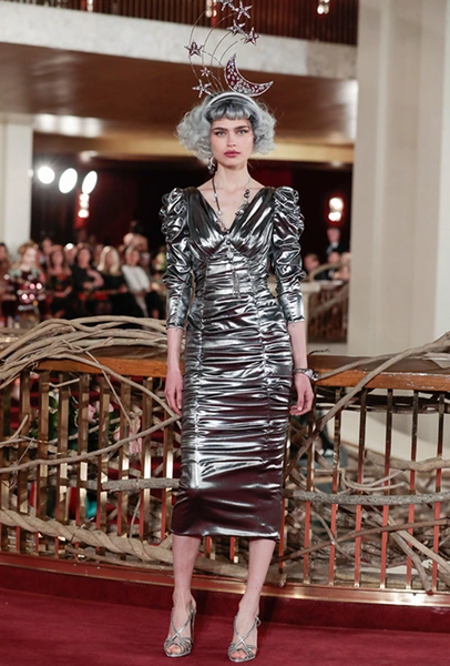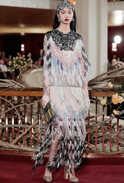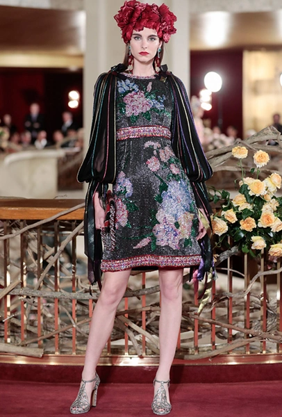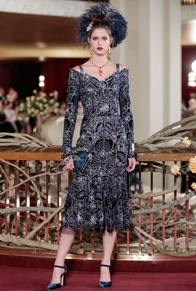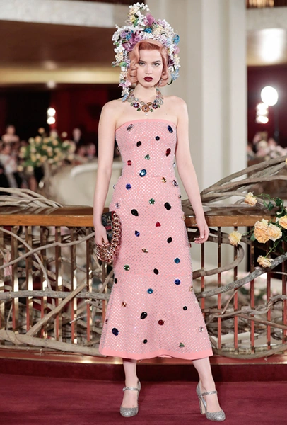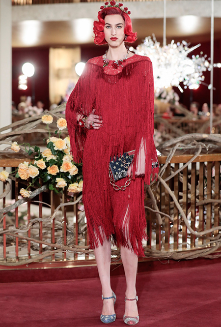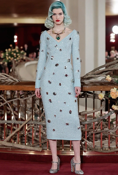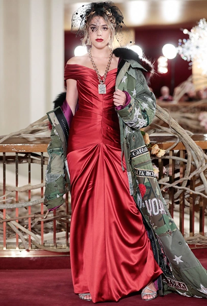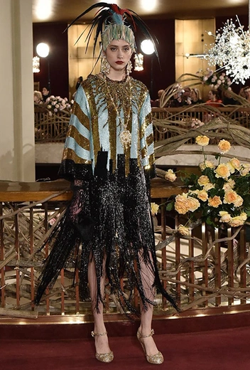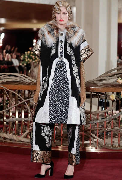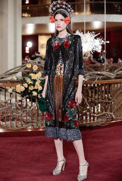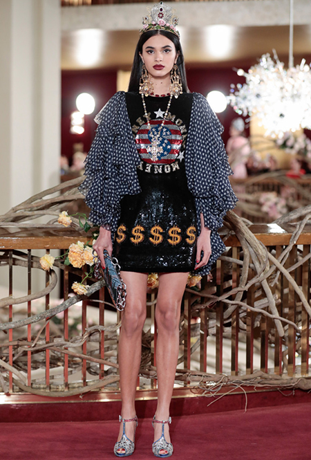 В своей работе дизайнеры смешивают две эпохи — «ревущие» 20-е и андеграундные 90-е. За первые отвечают украшения в духе Золотой эпохи Голливуда — ретро-туфли, щедро украшенные головные убор, прямой силуэт платьев, знаменитая «королевская» длина, а также короткие стрижки и укладка волнами. За вторые — спортивный крой и имитация граффити на одежде. Получилось так, как это любят Дольче и Габбано: ярко, броско и очень дорого (во всех смыслах этого слова).