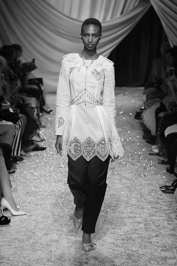 В этом году команда Ulyana Sergeenko впервые внедрила в коллекцию новую технику — холуйскую строчку. Команда дизайнеров специально выезжала в село Холуй, чтобы познакомиться со всеми нюансами техники. Сама техника, к слову, довольно любопытная: по льняной ткани продергиваются нитки одна за одной, затем по верху делается вышивка. Вставки с холуйской строчкой украсили несколько вещей из кутюрной коллекции — черную блузу-боди с объемными рукавами и белую юбку.