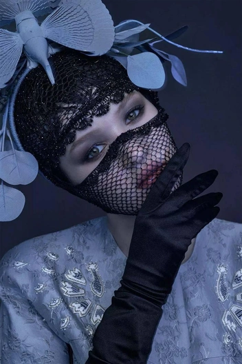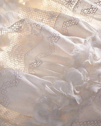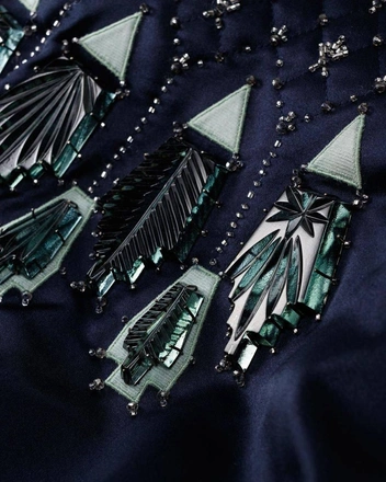 В этом году команда Ulyana Sergeenko впервые внедрила в коллекцию новую технику — холуйскую строчку. Команда дизайнеров специально выезжала в село Холуй, чтобы познакомиться со всеми нюансами техники. Сама техника, к слову, довольно любопытная: по льняной ткани продергиваются нитки одна за одной, затем по верху делается вышивка. Вставки с холуйской строчкой украсили несколько вещей из кутюрной коллекции — черную блузу-боди с объемными рукавами и белую юбку.
