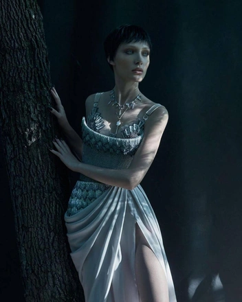 Относительно недавно, с 2022 года, модный дом Ulyana Sergeenko сотрудничает с Гусевским хрустальным заводом. Для отделки одежды и аксессуаров используется специальная техника: мастера выдувают вазы, которые затем разбивают, осколки покрывают алмазным напылением и в отдельных случаях вручную расписывают изображениями цветов и инициалами. Детали из хрусталя дополняют платья, головные уборы, сумки и аксессуары. Кутюрные наряды смотрятся фантастически и за счет игры света на камнях образуют изысканные переливы. За всем этим стоит кропотливый ручной труд: например, на создание платья с хрустальными бусинами уходит около 240 часов.