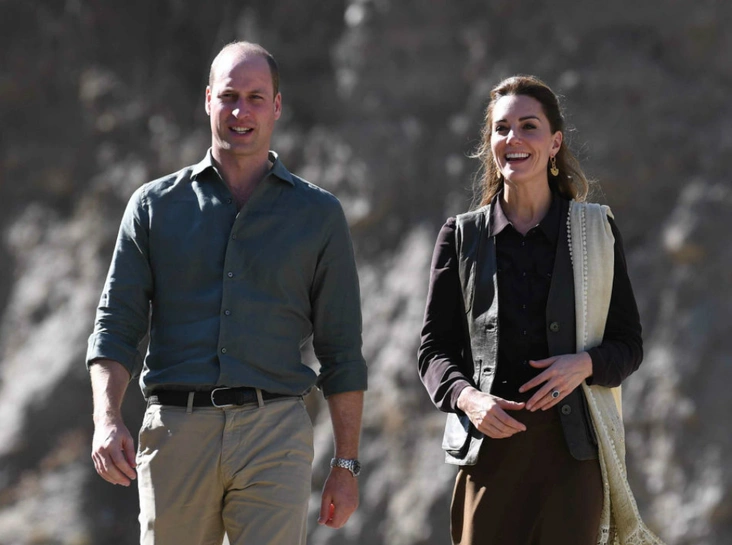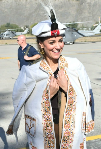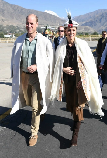 В среду королевская пара отправилась в горы, ближе к границе с Афганистаном, чтобы обсудить вопросы изменения климата. Кейт Миддлтон выбрала темную рубашку, заправленную в миди-юбку, жилет из нубука Really Wild, кремовое пальто с восточным орнаментом и теплую накидку. Также герцогине Кембриджской подарили колоритный национальный головной убор, которым она дополнила образ.