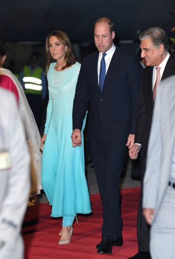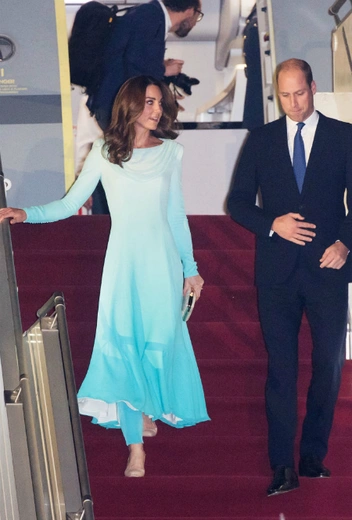 Герцог и герцогиня Кембриджские прибыли в Пакистан в понедельник утром. На выходе из самолета супруга принца Уильяма была запечатлена в бирюзовом комплекте от Catherin Walker, состоящего из длинного платья и брюк. Наряд, выбранный Кейт, называется шальвар-камиз и является традиционным южно-азиатским костюмом, который, к слову, могут носить и женщины, и мужчины.