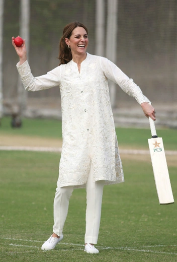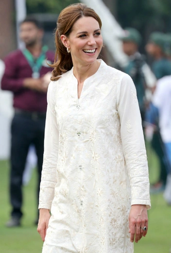Супруга принца Уильяма выбрала подходящий аутфит для подобного случая – белоснежный костюм шальвар-камиз от местного дизайнера Gul Ahmed, который дополнила платком в тон марки Maher Khan.