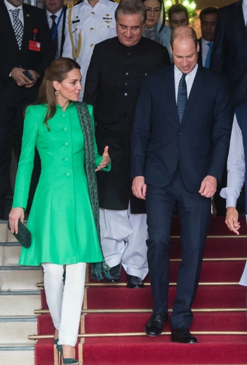 Вечером того же дня королевская пара отправилась на встречу с первыми лицами государства – президентом и премьер-министром Пакистана. Для официального мероприятия супруга принца Уильяма выбрала элегантное зеленое пальто Catherin Walker и белые брюки Maher Khan. К слову, зеленый является национальным цветом Пакистана. Образ герцогиня Кембриджская дополнила крупными серьгами от пакистанского бренда Zeen и узким шарфом с принтом марки Satrangi.