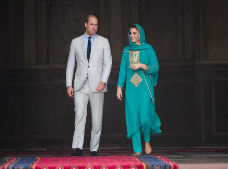 Позже королевская пара отправилась в мечеть Бадшахи. Герцогиня Кембриджская отдала предпочтение ярко-бирюзовому национальному костюму с золотой вышивкой марки Maher Khan, а голову герцогини Кейт покрывал платок в тон.