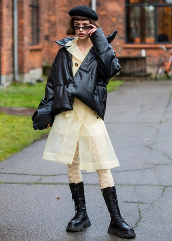 Колготки в сетку также остаются с нами в этом сезоне и подойдут как для повседневных образов, так и для более нарядных платьев длины мини и миди. Правда, зимой стоит носить тонкие колготки только в случае крайней необходимости — подвергать здоровье опасности не стоит. Присмотритесь к гороху: этот классический принт вошел в моду давно и по-прежнему актуален. Игривый рисунок добавит в образ женственности и идеально сочетается с элегантными платьями. Колготки в сетку и в горох также рекомендую носить черного цвета. Важно подбирать размер гороха и сетки так, чтобы они визуально не деформировали форму ноги.