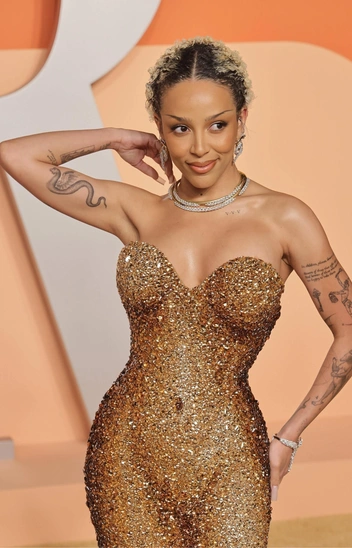 Вчера вечером певица Doja Cat, известная своими яркими аутфитами, появилась на вечеринке Vanity Fair в роскошном образе. Звезда надела золотое корсетное платье, украшенное тысячами кристаллов, которые складывались в силуэт обнаженного тела. А сияющим дополнением к нему стали бриллиантовые украшения: ожерелье, массивные серьги и браслет. Кажется, перед нами отличный пример того, что обыграть традиционно «голую» тему вечеринки можно даже совсем не раздеваясь.