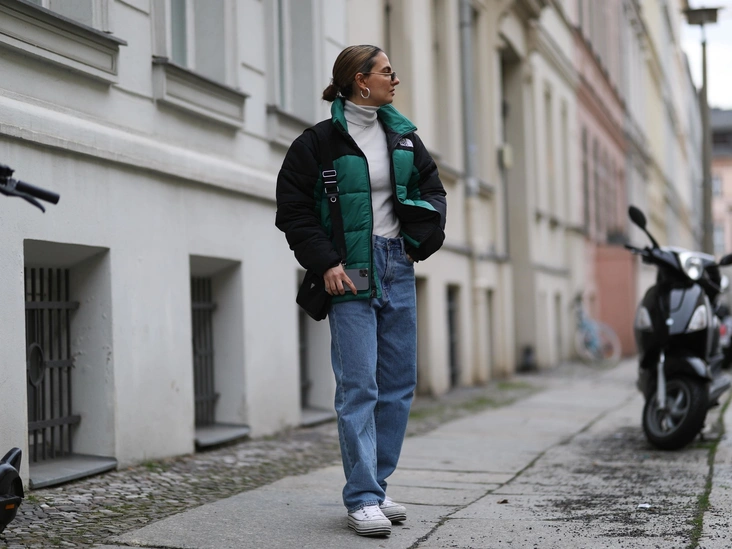 Зимой джинсы с широкими штанинами можно комбинировать с любимыми пуховиками. Дутые куртки, укороченные или полной длины, будут круто смотреться в компании самого актуального денима. Из обуви подойдут ботинки на грубой подошве, челси и даже обувь на каблуке, если, конечно, вы передвигаетесь по городу на машине (читайте также: Где сейчас покупать обувь на осень и зиму: 8 лучших брендов, которые заменят ушедшие).