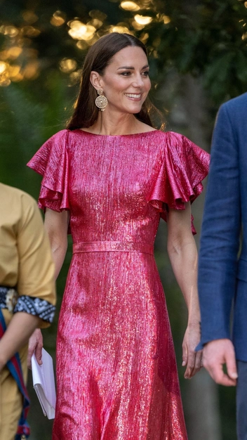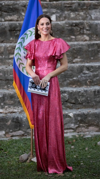 На приеме в Белизе во время карибского тура Кейт Миддлтон появилась в ослепительном вечернем платье The Vampire’s Wife. Принцесса не раз выбирала британский бренд для своих образов, одним из таких стало изумрудное платье для семейного портрета (читайте также: Королева иронии: почему Кейт Миддлтон так часто носит платья бренда «Жена вампира»). В этот раз ее выбор пал на ярко-розовое металлизированное платье с узким подолом, ремешком, подчеркивающим талию, и рукавами, которые моментально отправили нас в тридцатые годы прошлого столетия. Удивительно, как под вспышками камер наряд меняет свой цвет с фуксии на бордовый оттенок. Кейт дополнила образ серьгами O’Nitaa, белым клатчем с вышивкой майя и серебристыми босоножками Jimmy Choo.