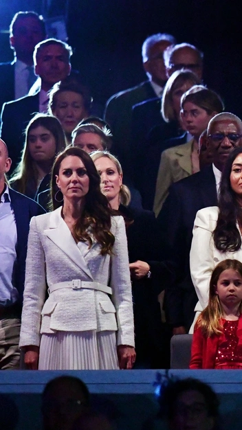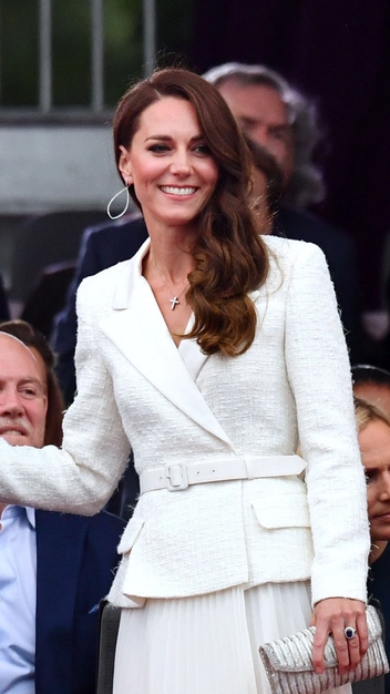 В Букингемском дворце во время празднования платинового юбилея Елизаветы II принцесса вновь отдала предпочтение чистому и женственному цвету. Она надела белоснежный костюм из букле и шифона с плиссированной юбкой британской марки Self-Portrait и подчеркнула талию узким кожаным ремнем. Кэтрин добавила к выходу серебристый клатч, серьги-кольца и цепочку с крестом. Нам нравится, что монаршая особа стремится к осознанному потреблению, ведь она часто появляется на публике в одних и тех же аутфитах. Например, в этом костюме принцессу мы уже видели на прошлогоднем приеме.