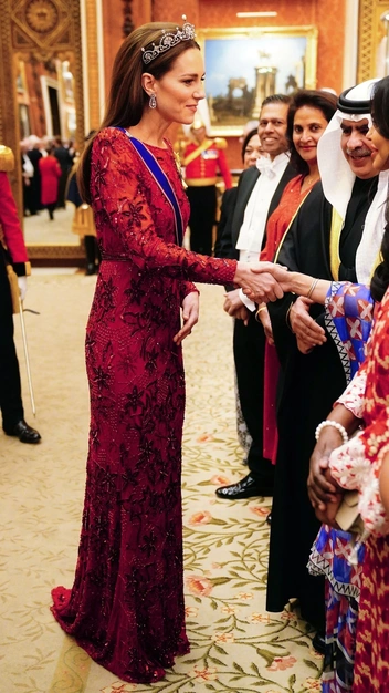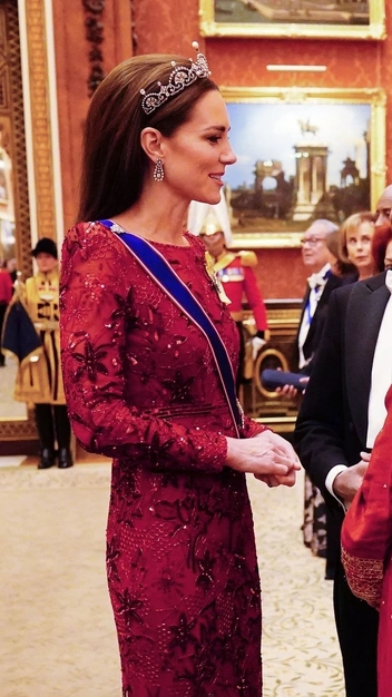 Под конец 2022 года монаршая чета посетила дипломатический прием в Букингемском дворце, и Кейт Миддлтон вновь поразила поклонников. Для мероприятия она выбрала роскошное алое платье в пол Jenny Packham, расшитое пайетками в форме цветов. Принцессе Уэльской идут оттенки бордового цвета, и она это знает, поэтому она вновь надела яркий и смелый образ, на который давно не решалась. Но наше сердце украли украшения. Тиара «Цветок Лотоса» с бриллиантами и жемчугом была раньше ожерельем, которое король Георг VI подарил своей возлюбленной и будущей жене — Елизавете Боуз-Лайон. Еще одна семейная реликвия — орден, на котором изображена Елизавета II в молодости.