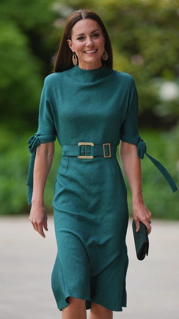 Еще одно платье изумрудного цвета с поясом и бантами на рукавах в коллекции Кейт Миддлтон стало работой канадского модельера Edeline Lee. Именно в нем она вручала премию Queen Elizabeth Award for British Design дизайнеру Солу Нэшу. Невероятный образ принцесса Уэльская подчеркнула золотыми серьгами, которые идеально сочетаются с глубоким зеленым оттенком. Соблюдая любимое правила монохрома, Кэтрин подобрала остроносые туфли и бархатный клатч под цвет наряда.
