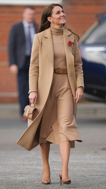 Принцесса Кэтрин — поклонница монохромных тотал-луков, что она вновь доказала в одном из своих выходов. Во время визита Скарборо Миддлтон надела потрясающий образ в бежевых тонах: прямое пальто Max&Co из верблюжьей шерсти и трикотажное платье с длиной ниже колена и высоким воротом, которое она подчеркнула кожаным ремнем Boden. Завершили осенний аутфит лакированные лодочки Ralph Lauren и мини-сумка с золотой фурнитурой.