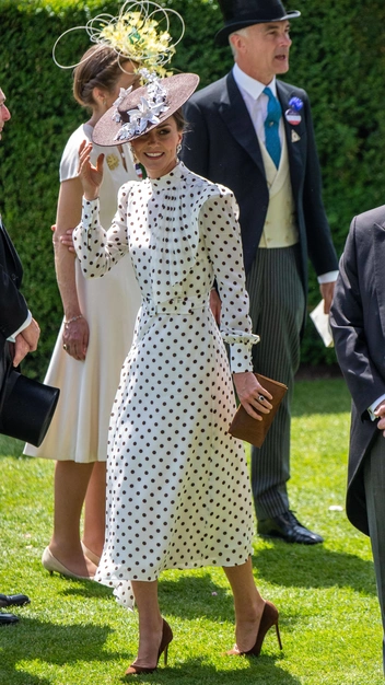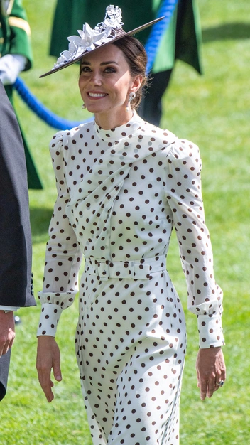 Поклонники королевской семьи с нетерпением ждут появления принца и принцессы Уэльских на ежегодных скачках Royal Ascot, ведь это значимое событие, на котором девушки показывают лучшие наряды и шляпки. От образа Кейт Миддлтон не оторвать взгляд: на ней самое романтичное белоснежное платье в горох с высоким воротом и длинными рукавами от Alessandra Rich, элегантная коричневая шляпа с широкими полями, а также лодочки и клатч под цвет головного убора. Образ Кэтрин стал оммажем покойной принцессе Диане, которая появилась в похожем платье на скачках в 1988 году. Миддлтон дополнила выход жемчужными серьгами, принадлежавшей ее свекрови.