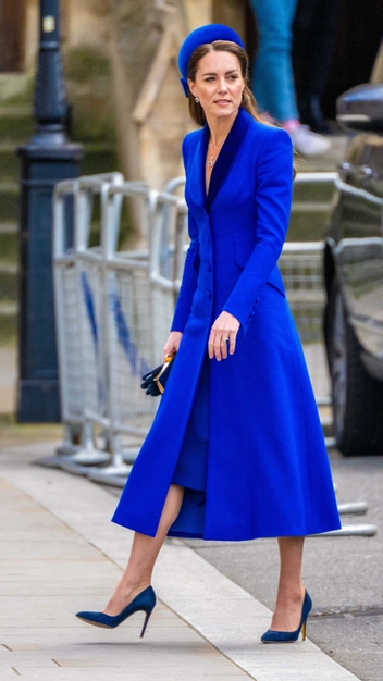 Одним из любимых цветов принцессы является синий, который символизирует чистоту и благородство. Она часто выбирает монохромные образы в разных оттенках: от сапфирового до яркого кобальтового. Во время службы в честь Дня Содружества наций Кейт Миддлтон появилась в пальто с воротником из шелкового бархата и массивными круглыми пуговицами от Catherine Walker, напоминающем по силуэту приталенное платье. Принцесса Уэльская дополнила образ аккуратной шляпкой, замшевыми лодочками на высоком каблуке и небольшим клатчем.