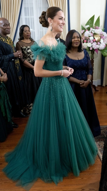 В этом году принцесса Кэтрин раскрылась по-новому: в вечерних нарядах ей не было равных. Во время тура по Карибам она представила самый фантастический наряд, о котором который хоть раз в жизни мечтала каждая из нас. Миддлтон появилась в бальном платье Jenny Packham глубокого зеленого цвета, украшенном стразами, с открытыми плечами и оборками у ключиц. Принцесса дополнила образ серьгами с изумрудом и бриллиантами и браслетом, который она позаимствовала из коллекции покойной королевы.