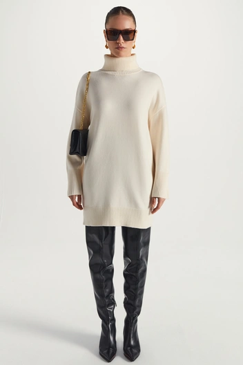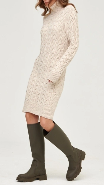 У платья, напоминающего свитер, есть все шансы остаться в моде в сезоне 2022/23. Однако тренд не касается моделей с вязкой, которая упрощает образ. Лучшее решение — приобрести аналогичный фасон лаконичного свободного кроя без объемного узора. Завершить элегантный образ предлагаем сапогами-слоучами и шубой из искусственного меха. При покупке обращайте внимание на состав: платья из кашемира и шерсти прослужат вам намного дольше, нежели из синтетических волокон.