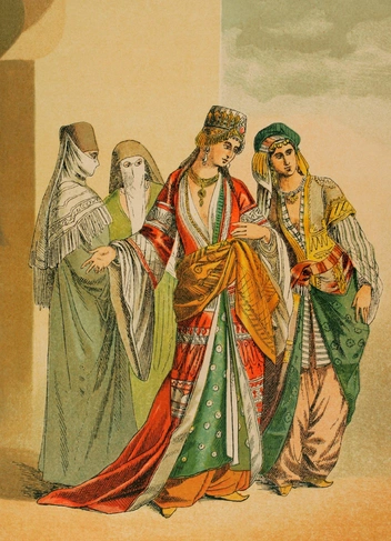 На лицо девушки также надевали платок, оставляя открытыми только глаза. А выходя в город, они вовсе скрывали все лицо — впрочем, на прогулки вне дворца имели право только мать и сестры правителя, а также хасеки-султан.
