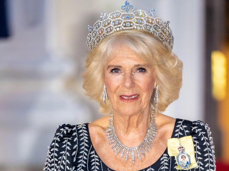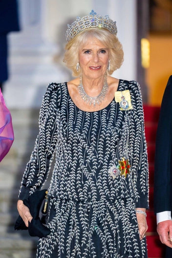 «На этом банкете мы впервые увидели, как Камилла делает все возможное, чтобы напомнить всем окружающим, что она королева. Стиль ее платья с заниженной талией и структурированной тканью характерен для обычной Камиллы, но при этом наряд украшен узорами в виде виноградных лоз, вышитых серебром. Это что-то новое и определенно царственное», — отметила стилист.