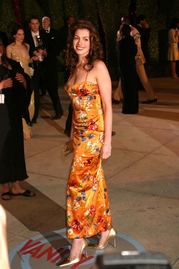 Сногсшибательный образ звезды на вечеринке Vanity Fair в 2004, вероятно, затмил тогда всех. Энн Хэтэуэй надела роскошное атласное платье с цветочным принтом и добавила к нему золотистые аксессуары. Согласитесь, оранжевый и золотой — не самое привычное сочетание. Однако актрисе удалось доказать, что оно очень эффектное.