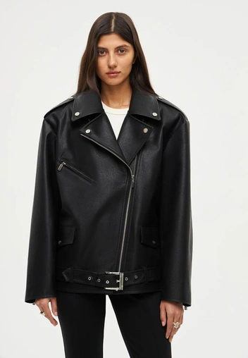 Такая модель тут же выдаст в вас равнодушного к моде и трендам человека. Во-первых, кожаные куртки приталенного кроя с прямым замком смотрятся дешево и неактуально. Во-вторых, из практически невозможно сочетать ни с каким топом. Обо всех объемных свитерах и свитшотах придется забыть.