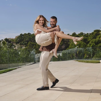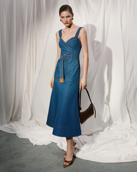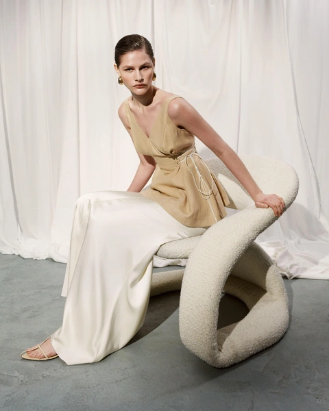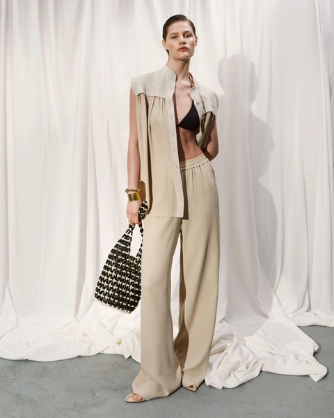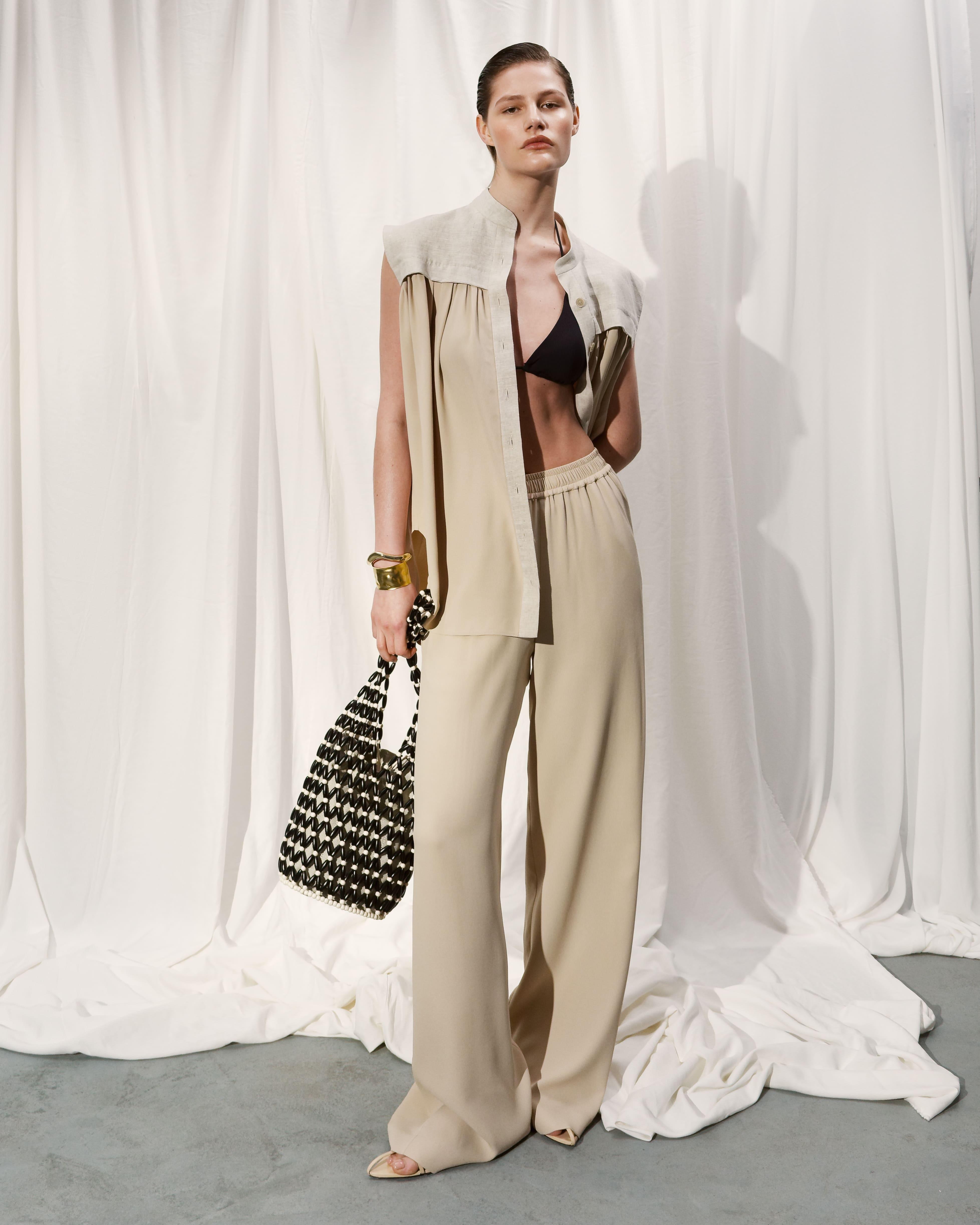 Элегантность соединяется с легкостью и изящностью, проявляясь в летящих фактурах, открытых силуэтах, а также в деталях, которые делают образ более загадочным. Асимметричные вырезы, фирменные для бренда шнуровки, корсеты — всё это позволит быть каждый день разной и при этом оставаться в единой стилистике. Костюмы из льна с брюками и юбками, а также платье из денима, дополненное ремнем с акцентной кожаной вставкой, впишутся не только в круизный, но и в летний городской гардероб. А спутником для размеренного завтрака или для прогулки на яхте станет бестселлер TAMI GEE — молочный костюм пижамного силуэта из натурального шелка с фирменным принтом песочного цвета.