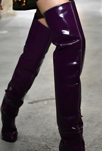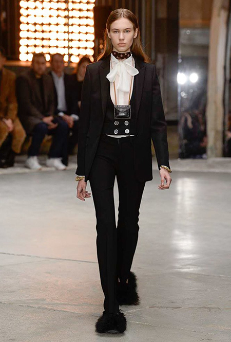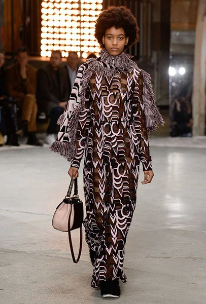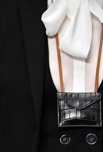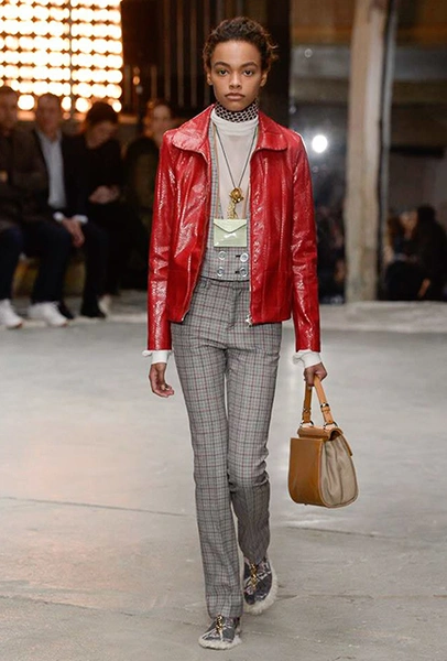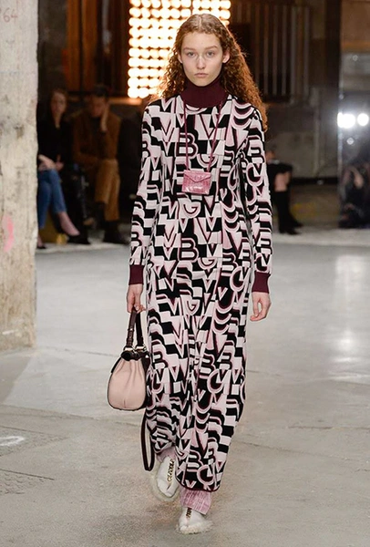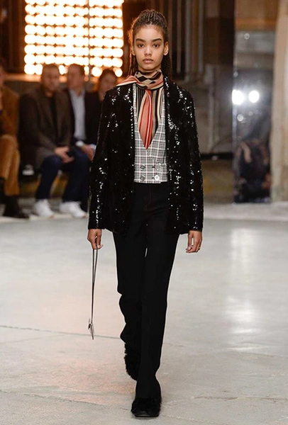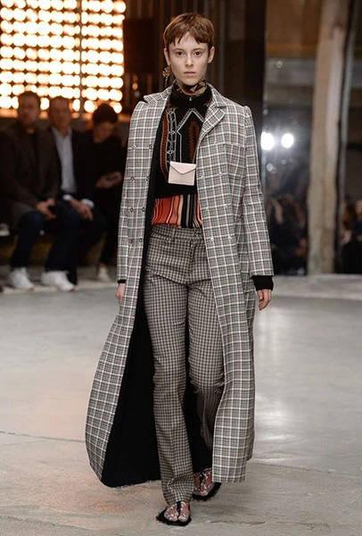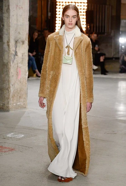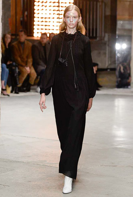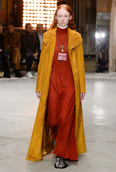 Кроме них стоит обратить внимание на аксессуары и обувь. Из первых выделяются крохотные прямоугольные сумки, которые Валли предлагает носить – как кулоны, подвешенными на шею. Кстати, не ему одному пришла в новом сезоне в голову подобная идея – похожие мини-сумочки есть, например, у Jacquemus. Что до обуви, то здесь дизайнер продолжает разрабатывать тему, начатую еще в сезоне SS2018 и выпускает на подиум моделей в шлепанцах, чьи подошвы оторочены мехом. Здесь есть и туфли на небольшом каблуке, украшенные перьями, и высокие лаковые ботфорты.