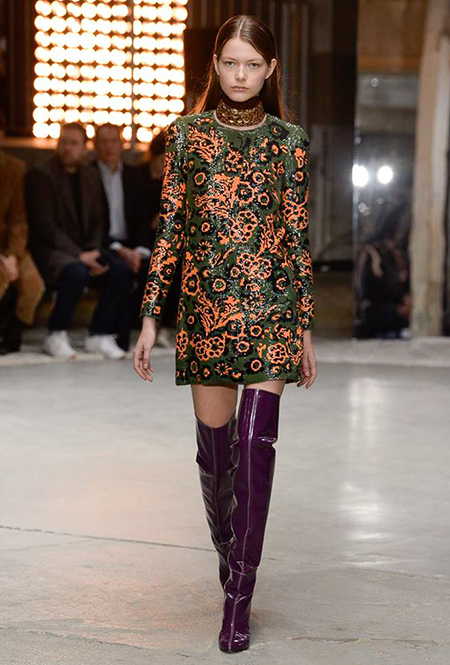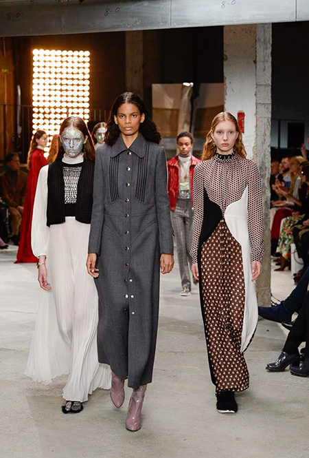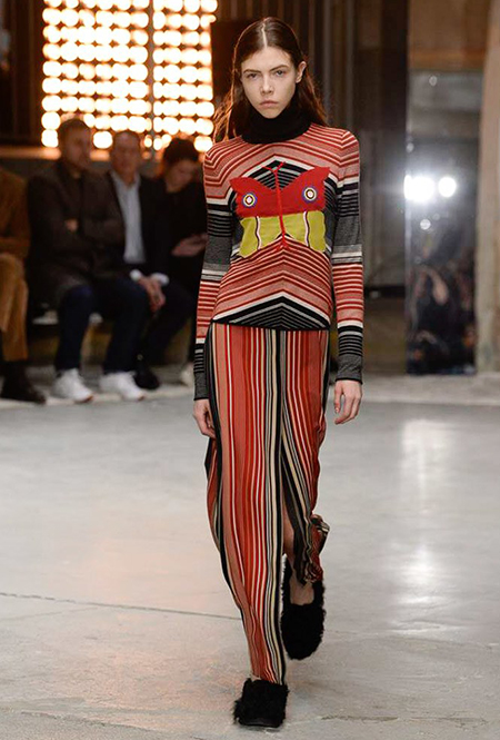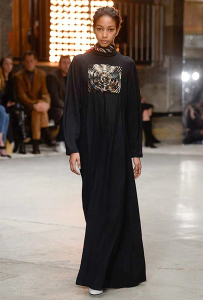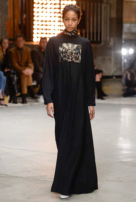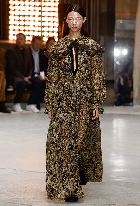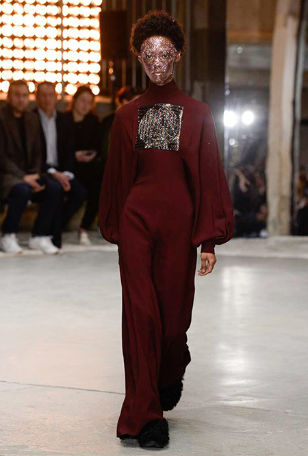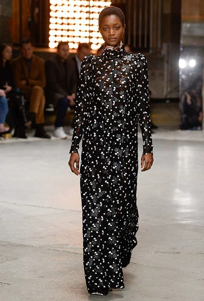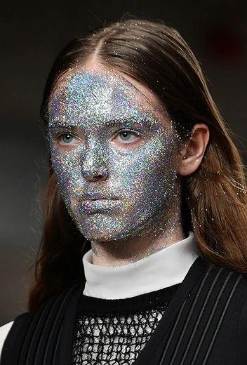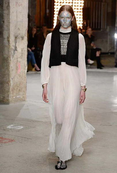 Отдельная тема – макияж. Лица некоторых моделей, будто масками, покрыты плотным слоем цветных блесток. В этом видится нечто фантастическое и инопланетное. Впечатление усугубляют нашивки на лифах платьев – с рисунками в виде цветных спиралей, отдаленно напоминающими снимки галактики из космоса.