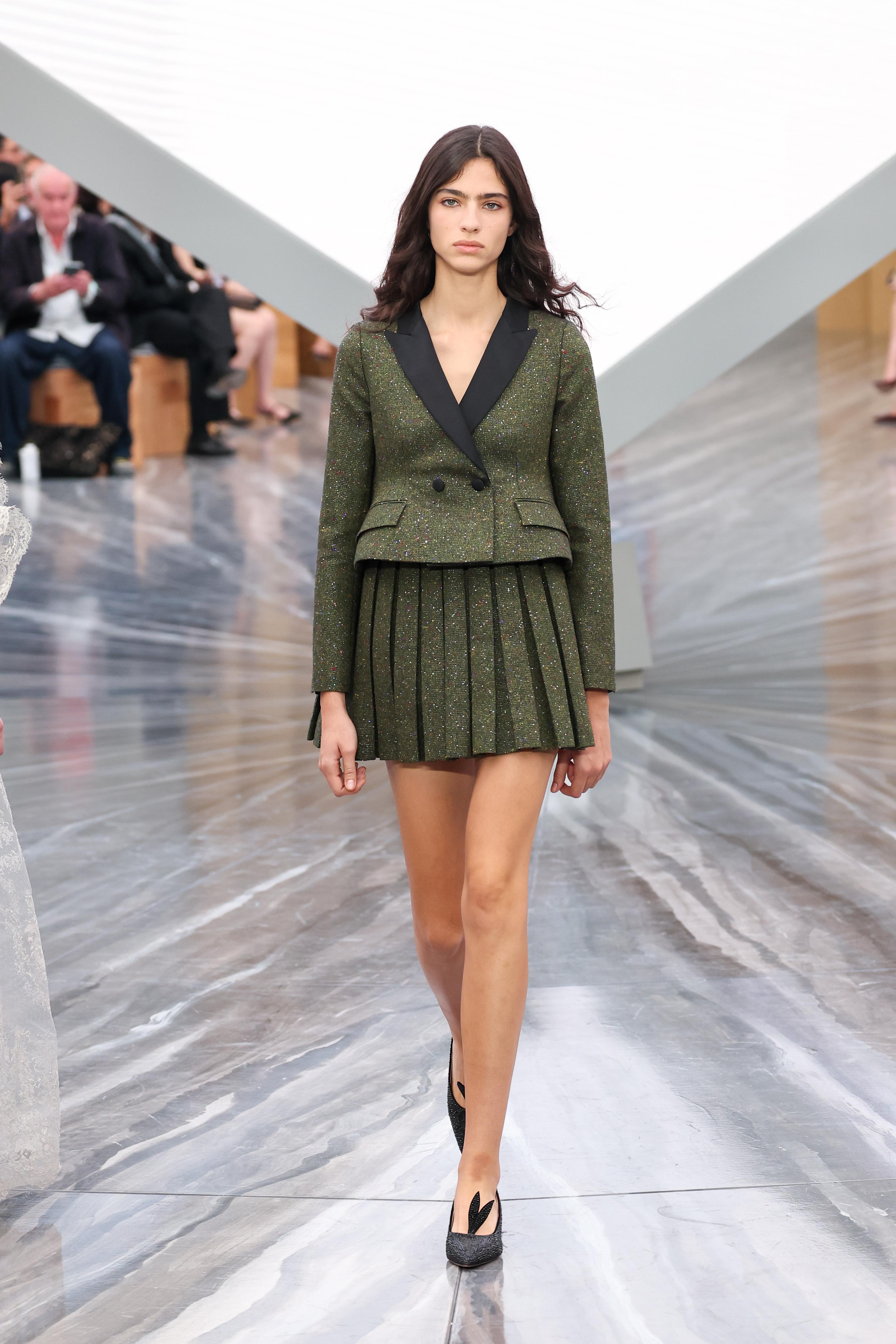 Джонатан Андерсон выстраивает свою первую коллекцию для Dior вокруг британской строгости: юбочные костюмы, которые держат силуэт, строгие плечи без перегибов, перчатки как обязательный жест, и платок, завязанный не театральным бантом, а лаконичной «галочкой» — прям как у Елизаветы II.