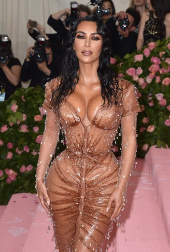 На ковровой дорожке Met Gala в 2019 году звезда показала, что «голые» наряды могут быть произведением искусства. Звезда предстала перед публикой в нюдовом платье от Mugler, которое имитировало обнаженное тело, с которого стекали капли воды. Этот наряд стал первым творением самого Тьерри Мюглера за 20 лет был отсылкой к культовому образу Софи Лорен в фильме 1957 года «Мальчик на дельфине». Наряд Кардашьян был выполнен из латекса бежевого оттенка с декором из бисера и полупрозрачных кристаллов, которые создавали эффект капель, как будто звезда только-только вышла из океана (читайте также: 17 «голых» платьев звезд, в которых вы не смогли бы ни есть, ни сесть).