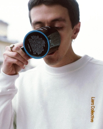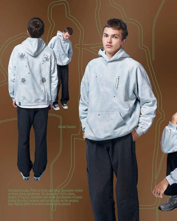 Вариация в более спокойных тонах, но все же с необычными деталями — худи, окрашенное вручную, с декоративными люверсами и принтом на задней стороне. Плюс одна из самых полюбившихся моделей — рубашка с абстрактным узором в нежных оттенках. Заключительным штрихом аутфита станут кепка, шопер или отдельный капюшон с вышивками, каждый аксессуар сделан в духе Liars Collective — с изюминкой.