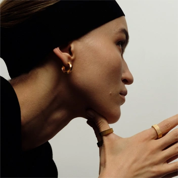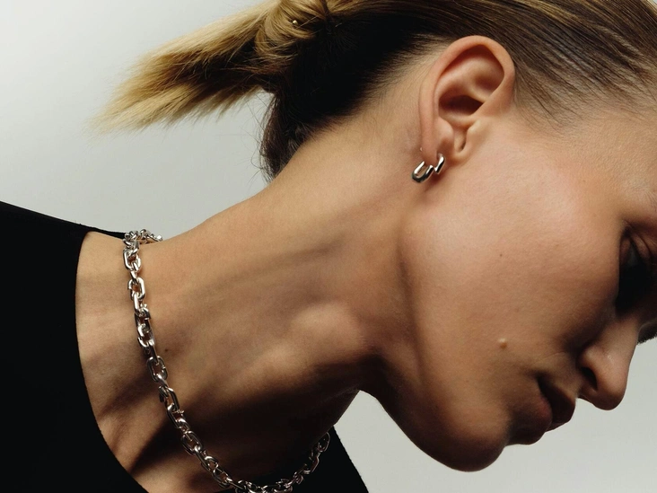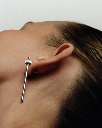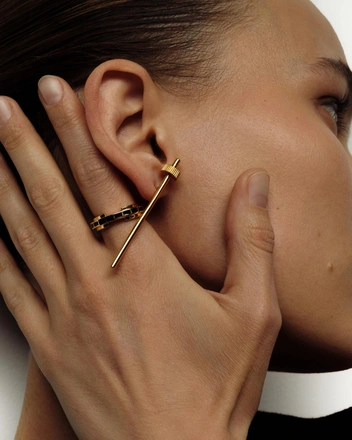 Это форма родилась из воспоминаний о модернистских сооружениях XX века с ленточным остеклением, которое занимало всю видовую стену. Можно вспомнить советский ресторан «Седьмое небо» на Останкинской телебашне или Брюссельский павильон в Праге, в Летенских садах. Вытянутую моносерьгу у бренда можно заказать в серебре или золоте (белом или желтом).