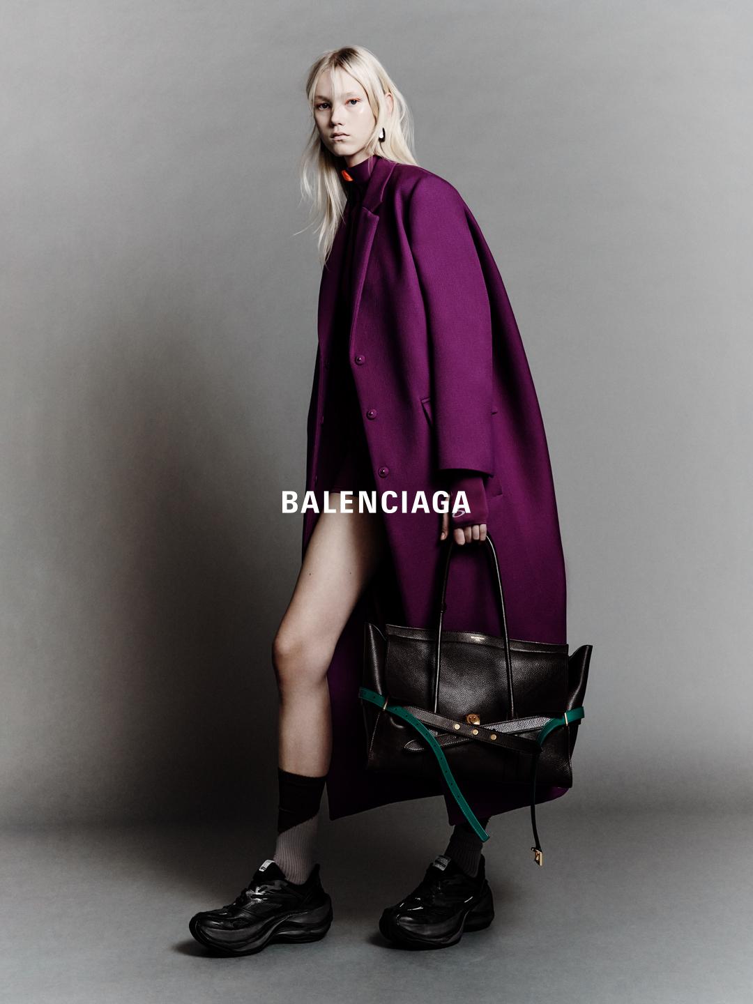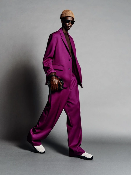 С чем Пиччоли точно не стал экспериментировать, так это с фирменным цветом Дома. Фиолетовый в Balenciaga — полноценный язык: он появляется в верхней одежде, аксессуарах и даже в спортивных вещах, связывая воедино все коды бренда. На его фоне сложные силуэты и стилистические игры считываются мягче, а присущий Дому драматизм обретает менее агрессивное, почти бархатное звучание.